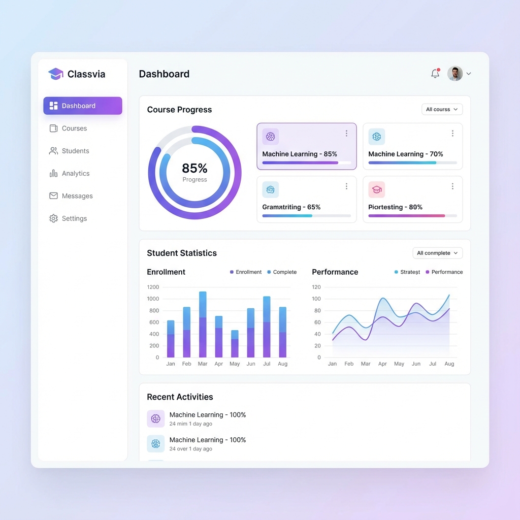 Classvia is a cloud-based Learning Management System (LMS) SaaS platform designed to help individuals, institutes, companies, and universities launch and manage online learning platforms easily. It supports both Single Instructor / Institute LMS and Multi-Instructor SaaS Marketplace (Udemy-style) models.